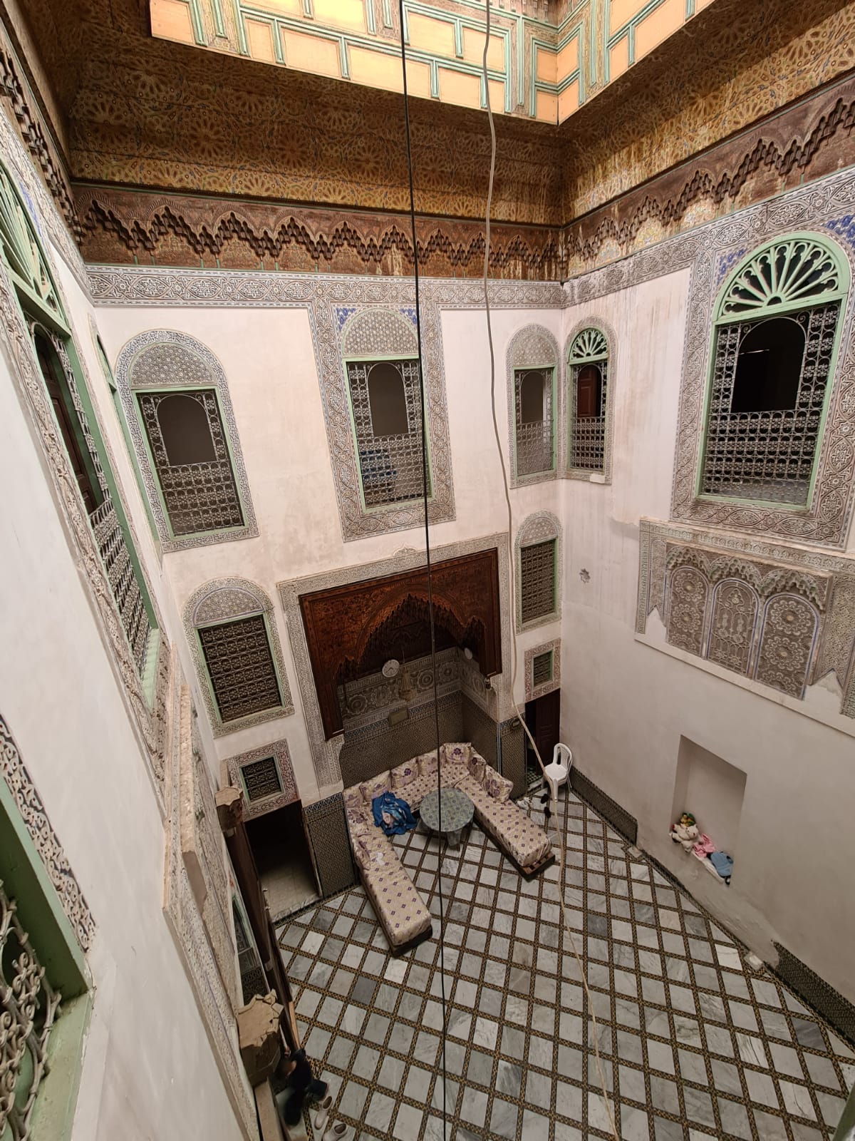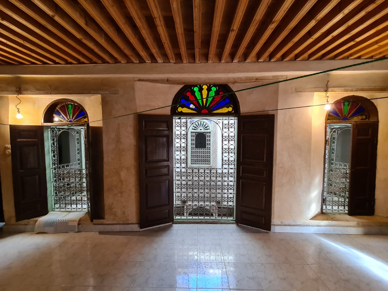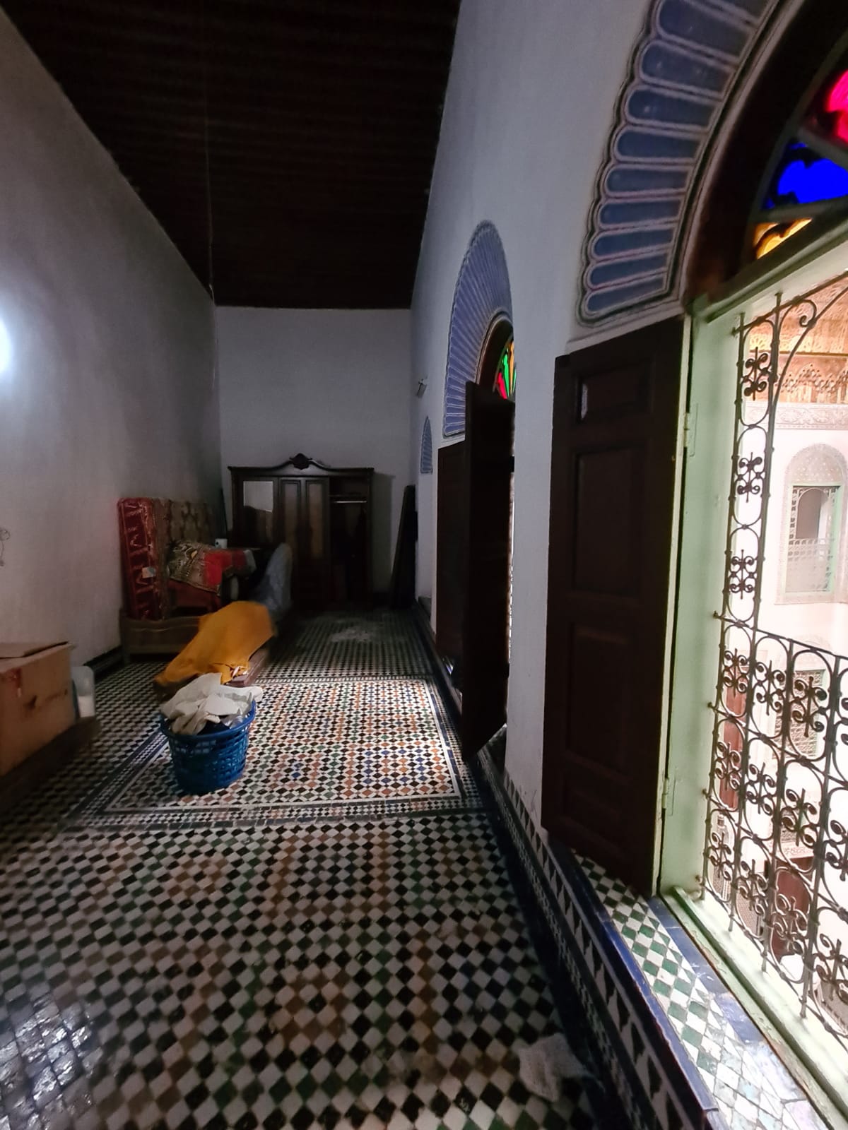 الطابق الأرضي: فناء مع برطال، صالون، مطبخ، غرفتين تخزين