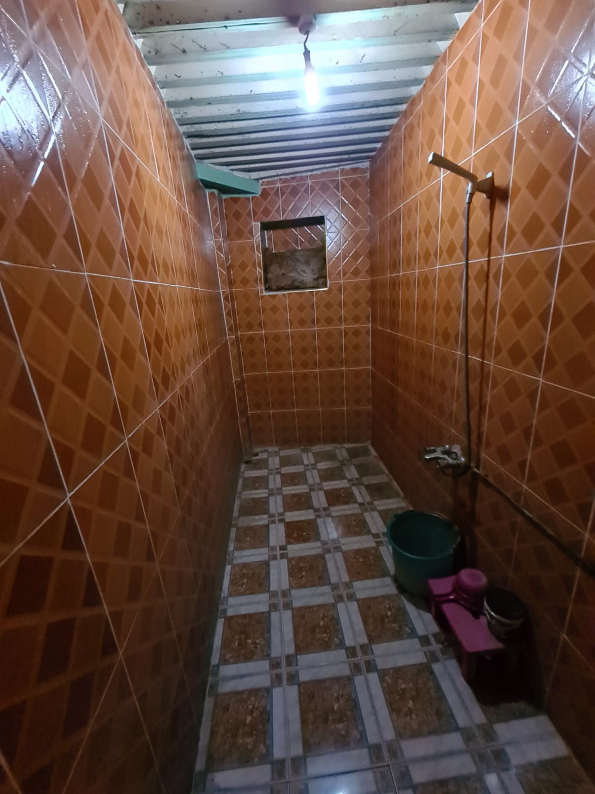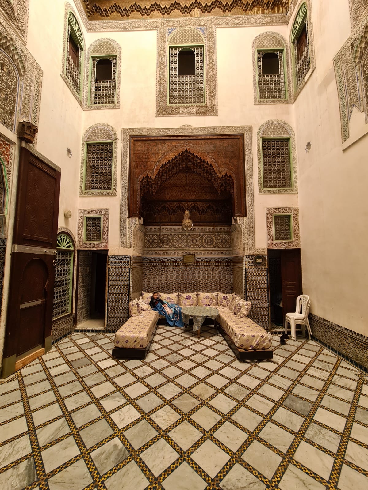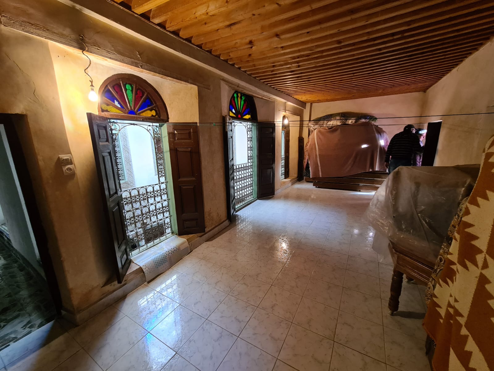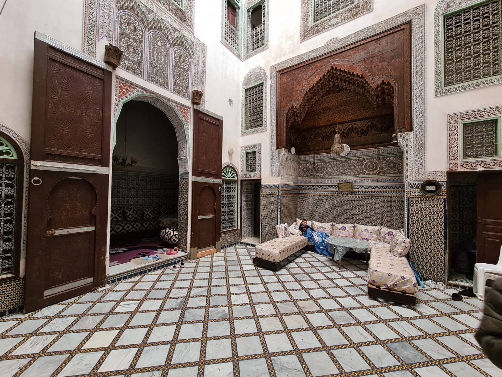 الطابق الأرضي: فناء مع برطال، صالون، مطبخ، غرفتين تخزين